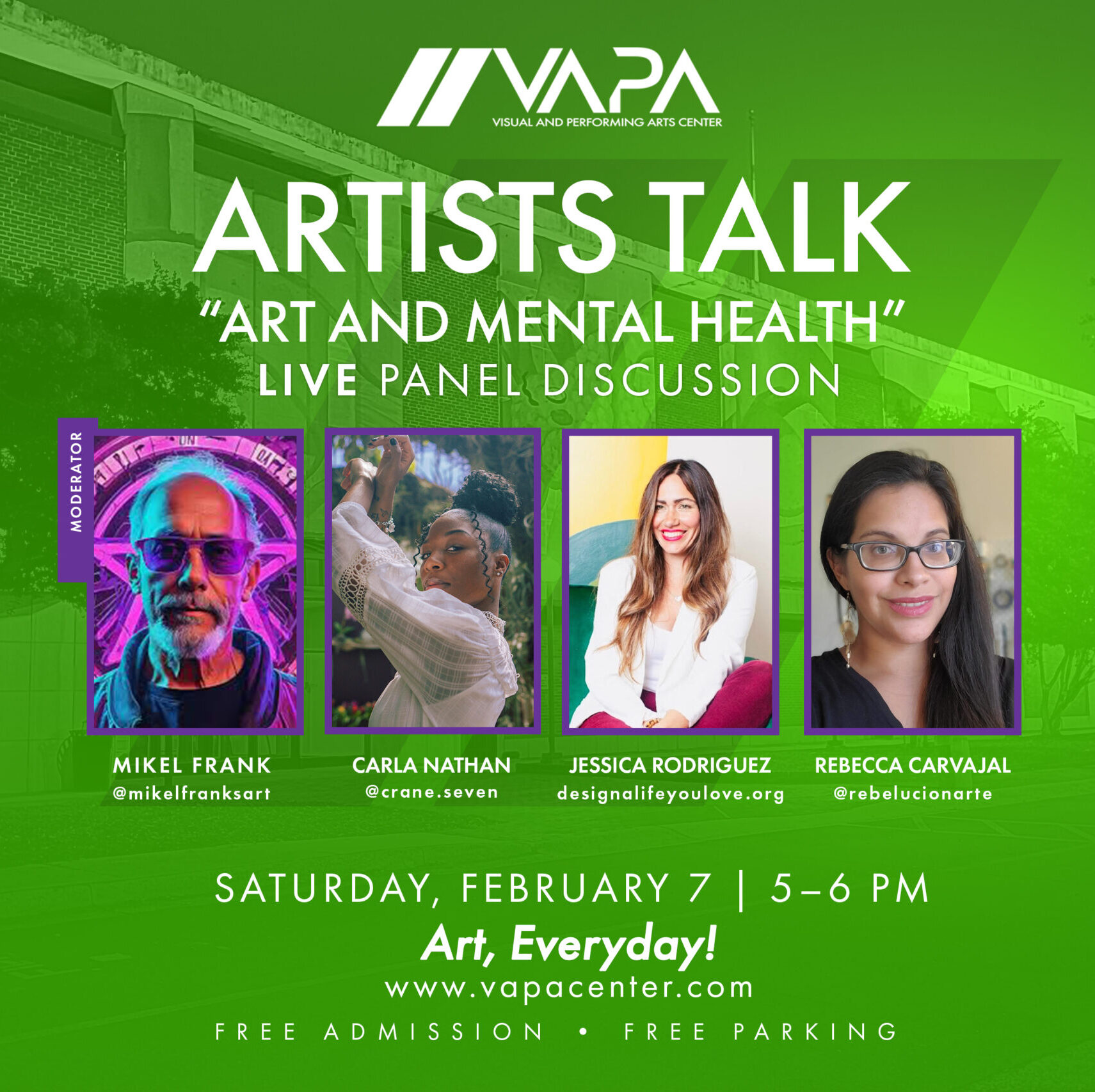 Artists Talks at the VAPA Center are held at 5 PM every Open Studio, first Saturday of the month.Join us and take a seat to listen to three artists discuss their unique way of creativity. Each panel is curated with a common theme stemming from their genre, style, or approach at creating. These panels are a great opportunity for artists to learn from one another, and may even learn a life lesson in the process.No matter if you think of yourself as an artist or a creative, it’s always entertaining to learn how the master mind works behind the canvas.