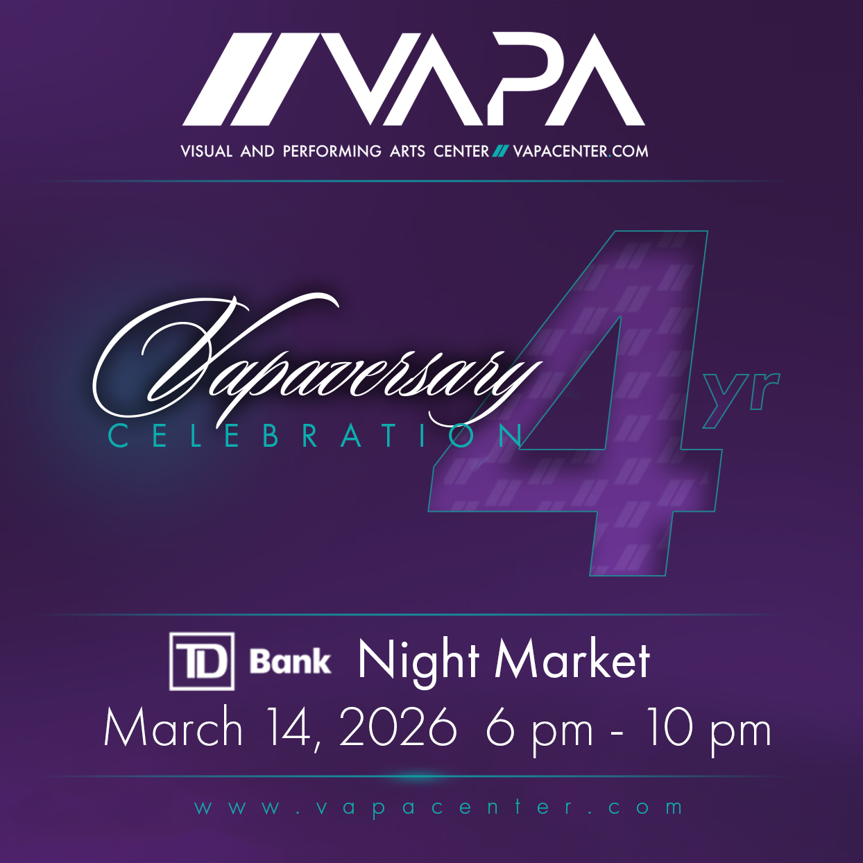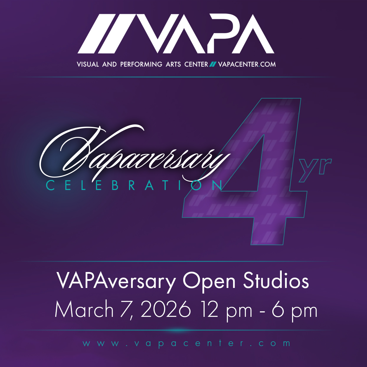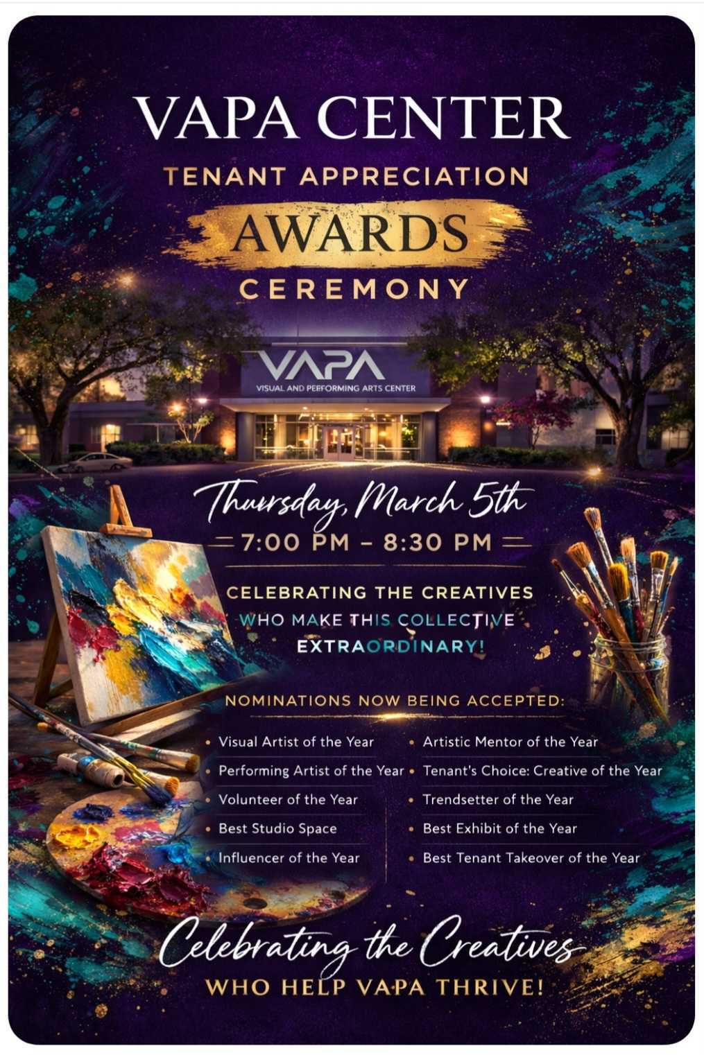 Join us for an exciting evening of celebration, creativity, and community at the 2026 1st Annual VAPA Center’s Tenant Appreciation Event & Awards as part of our 4th VAPAversary Celebration. This special event is all about you, our talented tenant artists. We invite you to enjoy a night of fun, food, and festivities as we honor the incredible contributions and achievements of our vibrant artistic community.