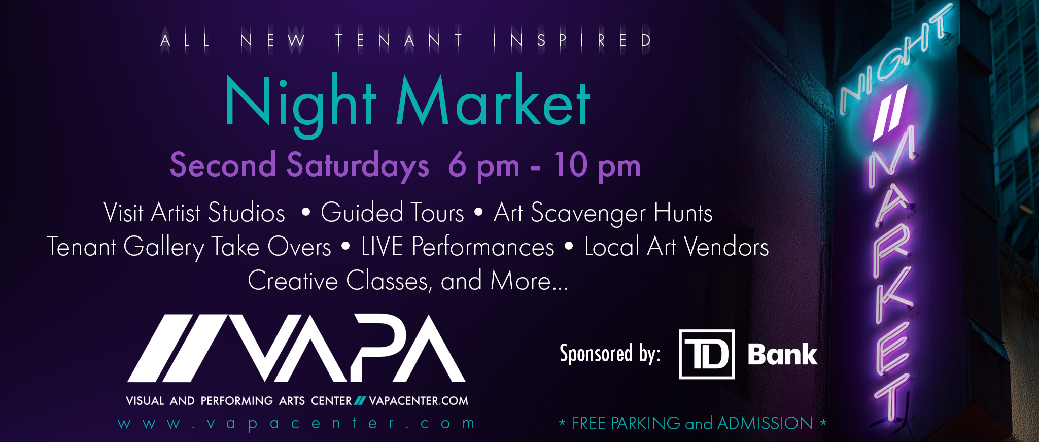 Step into a building where creativity thrives and the vibrancy of art comes alive at the VAPA Center’s Night Market, proudly sponsored by TD Bank.